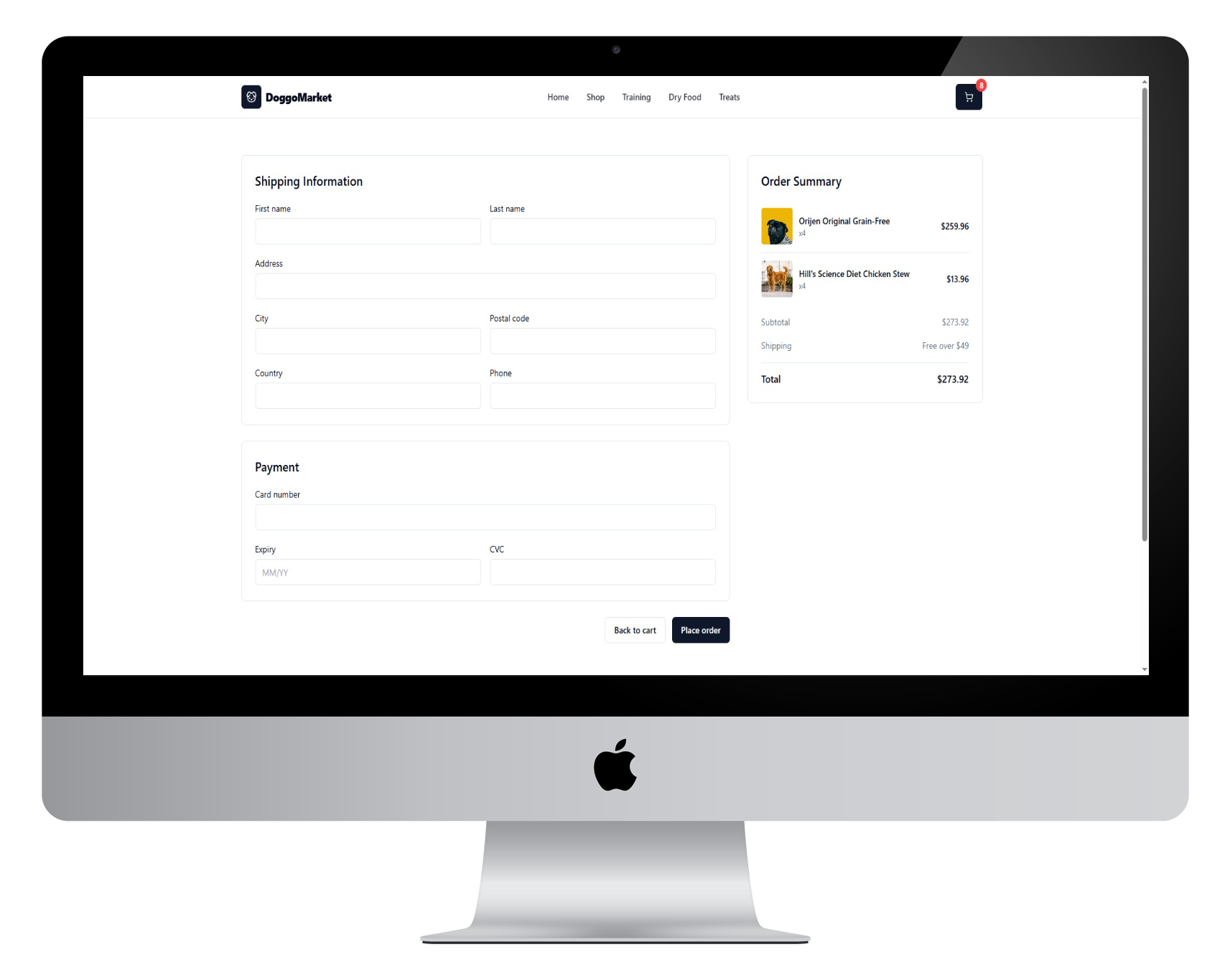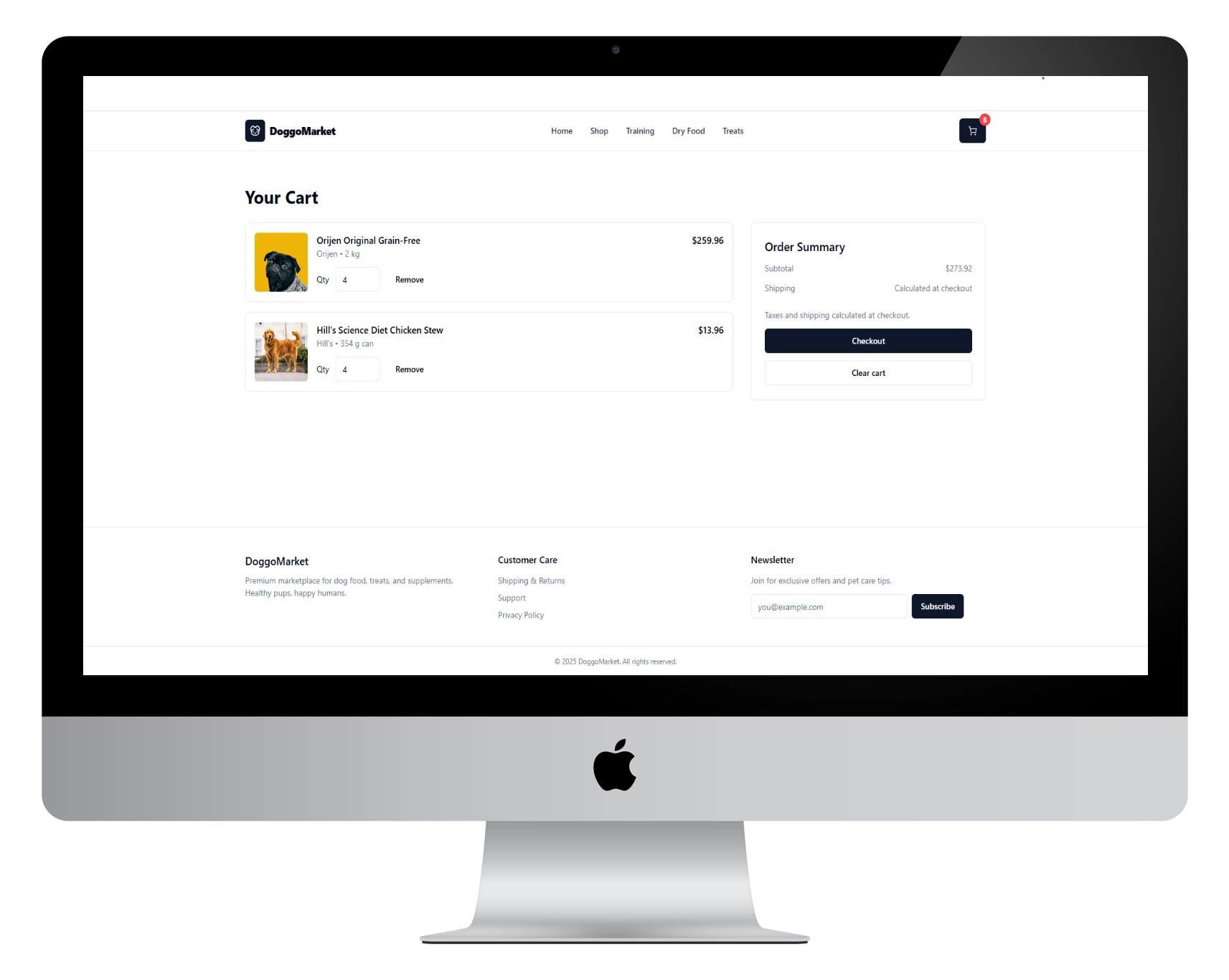 Dog Food Marketplace where customer can select quantity and place order. Design is clean and responsive. Order flow is simple.